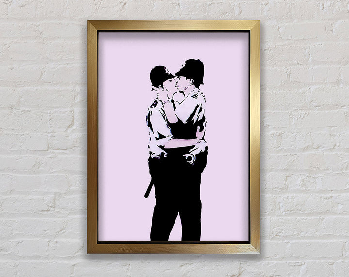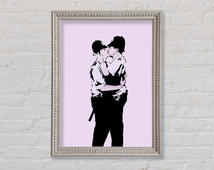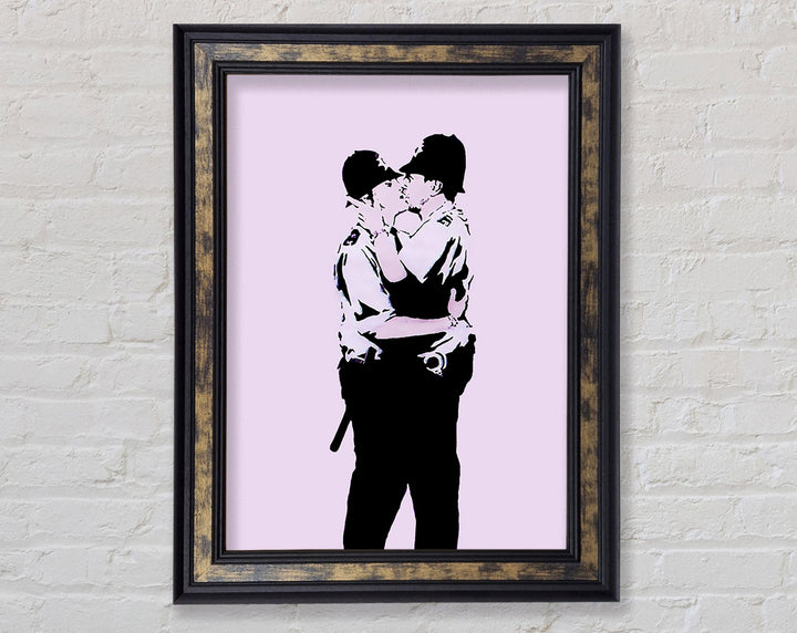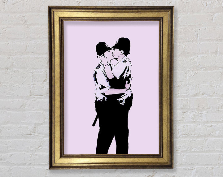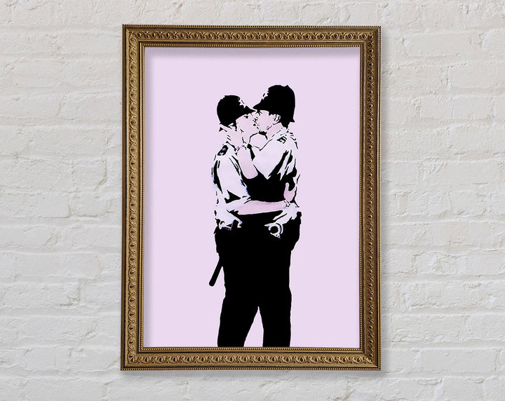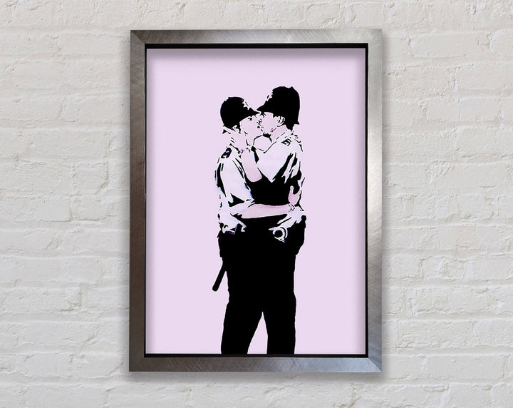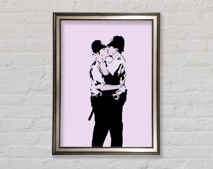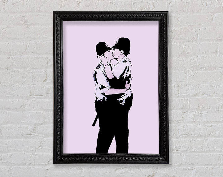 Introducing the Kissing Coppers Pink Framed Print, a stunning piece of framed art that brings a touch of modern elegance to any space. This unique print captures the iconic image of two police officers sharing a kiss, set against a vibrant pink background. Available in six different sizes, from small to oversized, this artwork can perfectly fit any wall, big or small.