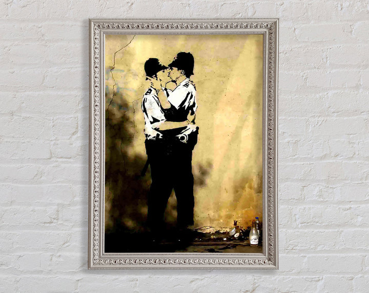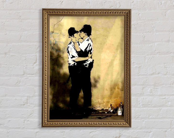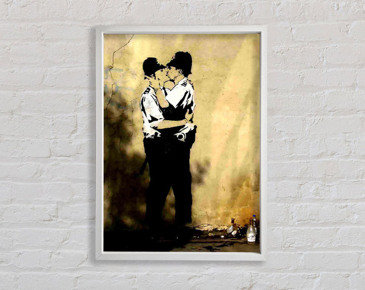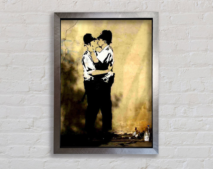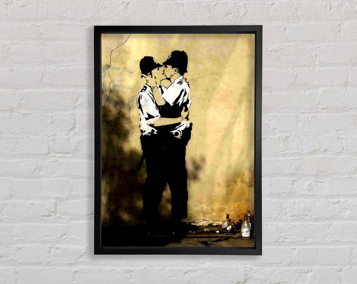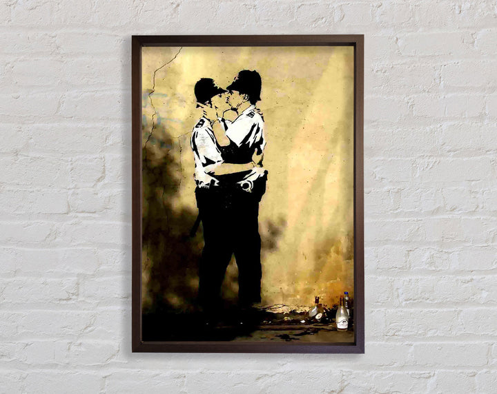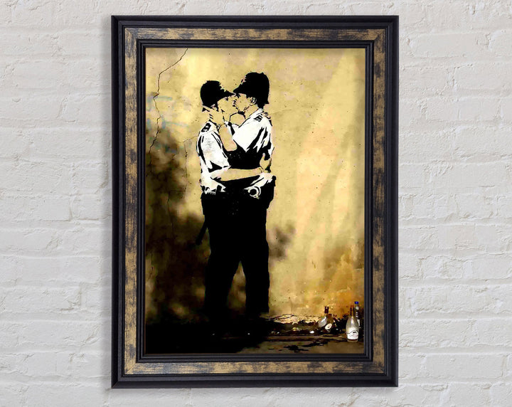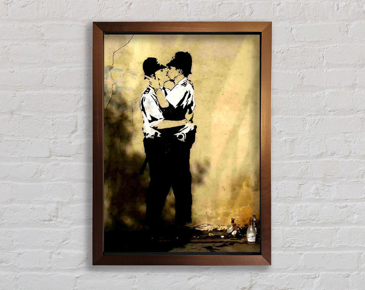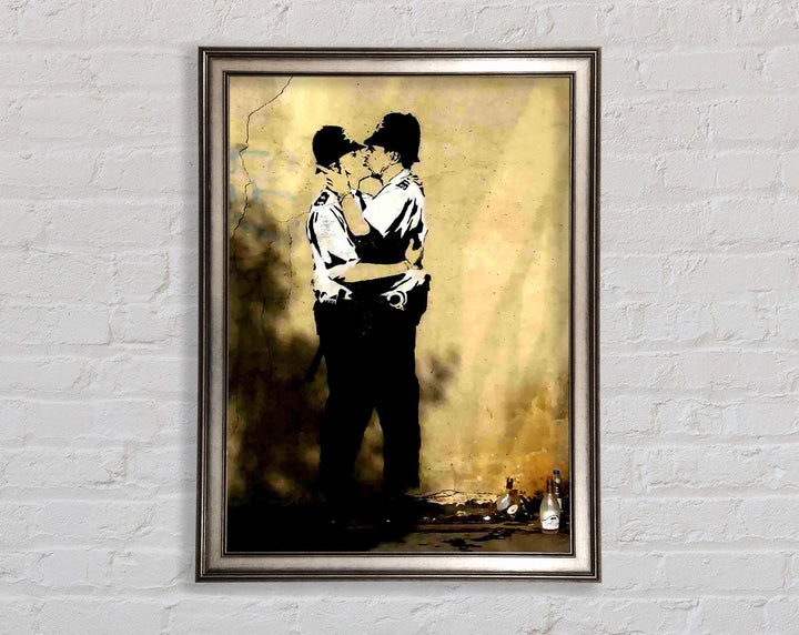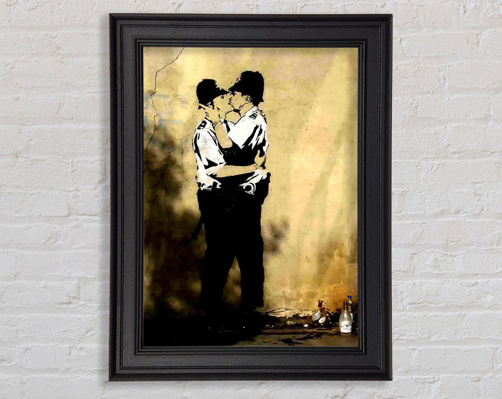 Introducing the Kissing Coppers Portrait Framed Print, a stunning piece of framed art that captures the iconic moment with striking detail. This unique artwork is available in six sizes, ranging from small to oversized, ensuring a perfect fit for any space. Choose from a variety of colors to match your decor, adding a personalized touch to your home or office.