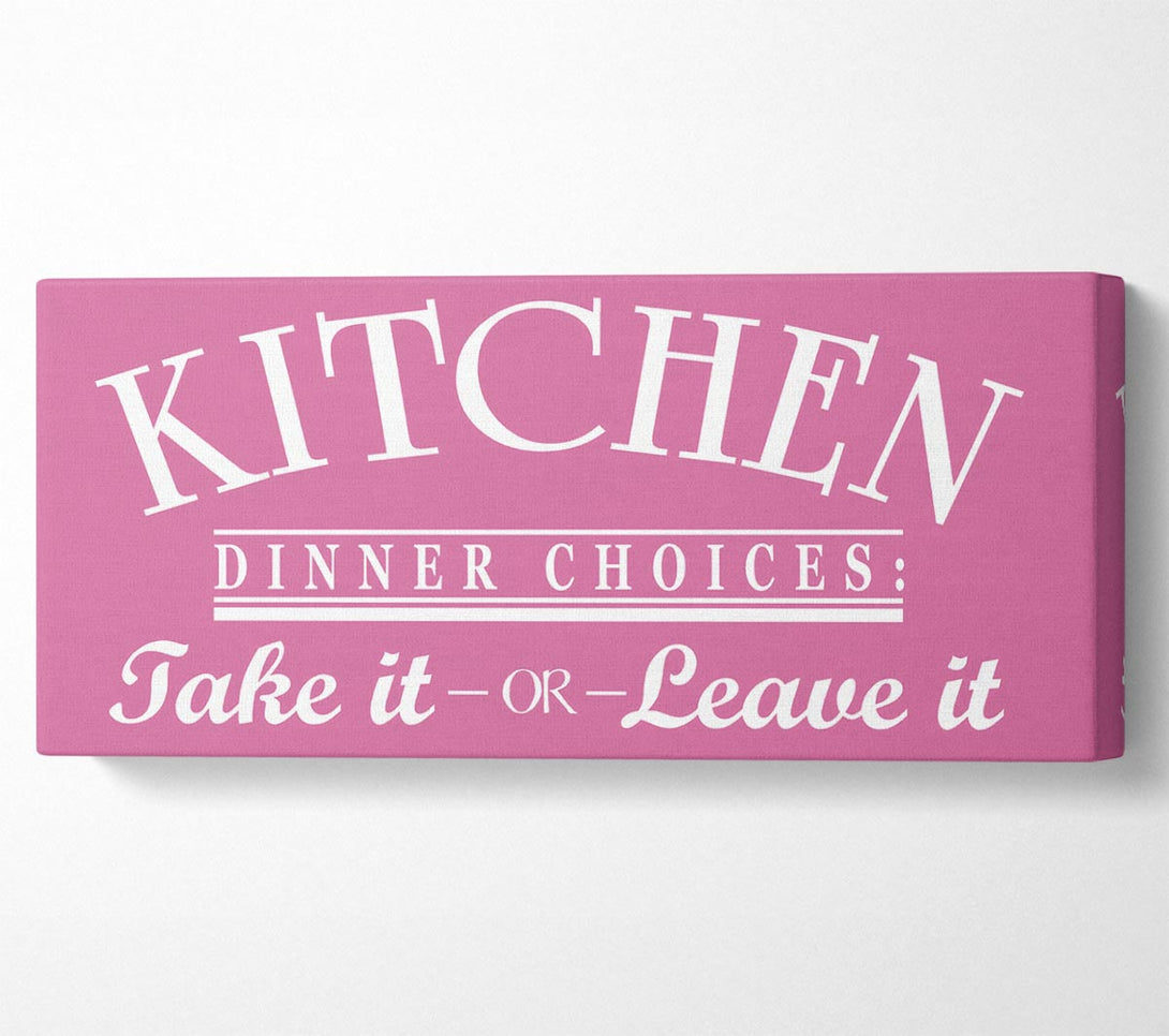 Kitchen Quote Dinner Choices Pink canvas, printed on coated polyester canvas. Mounted on to a 44mm box frame, ready to hang.