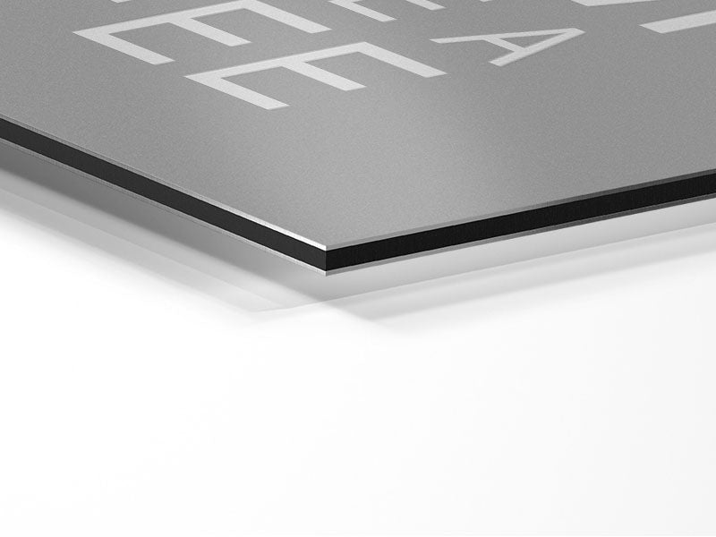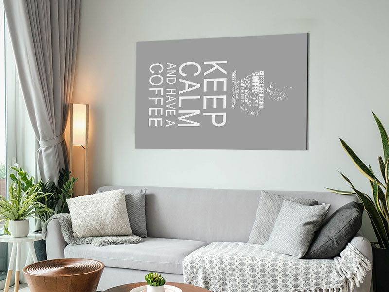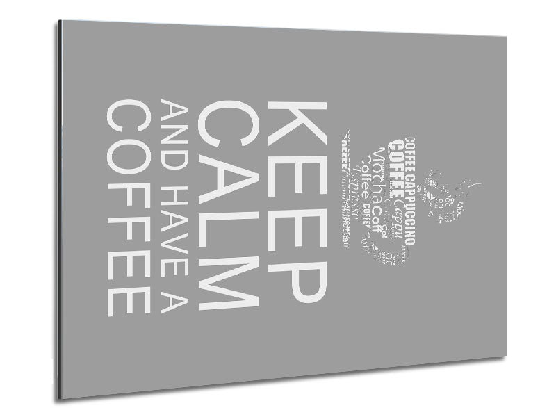 Kitchen Quote Keep Calm And Have A Coffee Grey White Printed on brushed aluminium dibond. A modern way to display art and easy to maintain.