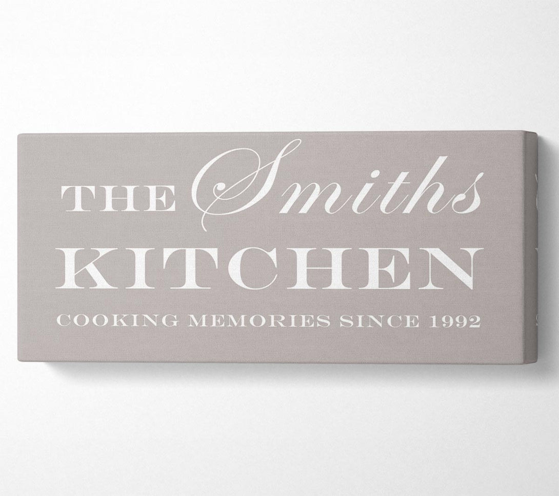 Kitchen Quote Your Family Name And Date Kitchen Beige canvas, printed on coated polyester canvas. Mounted on to a 44mm box frame, ready to hang.