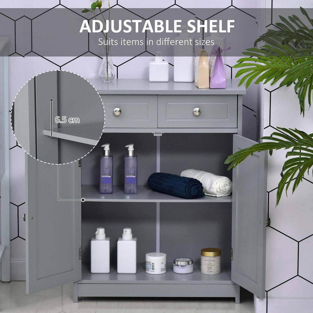 kleankin 75x60cm Freestanding Bathroom Storage Cabinet Unit w/ 2 Drawers Cupboard Adjustable Shelf Metal Handles Traditional Style Grey