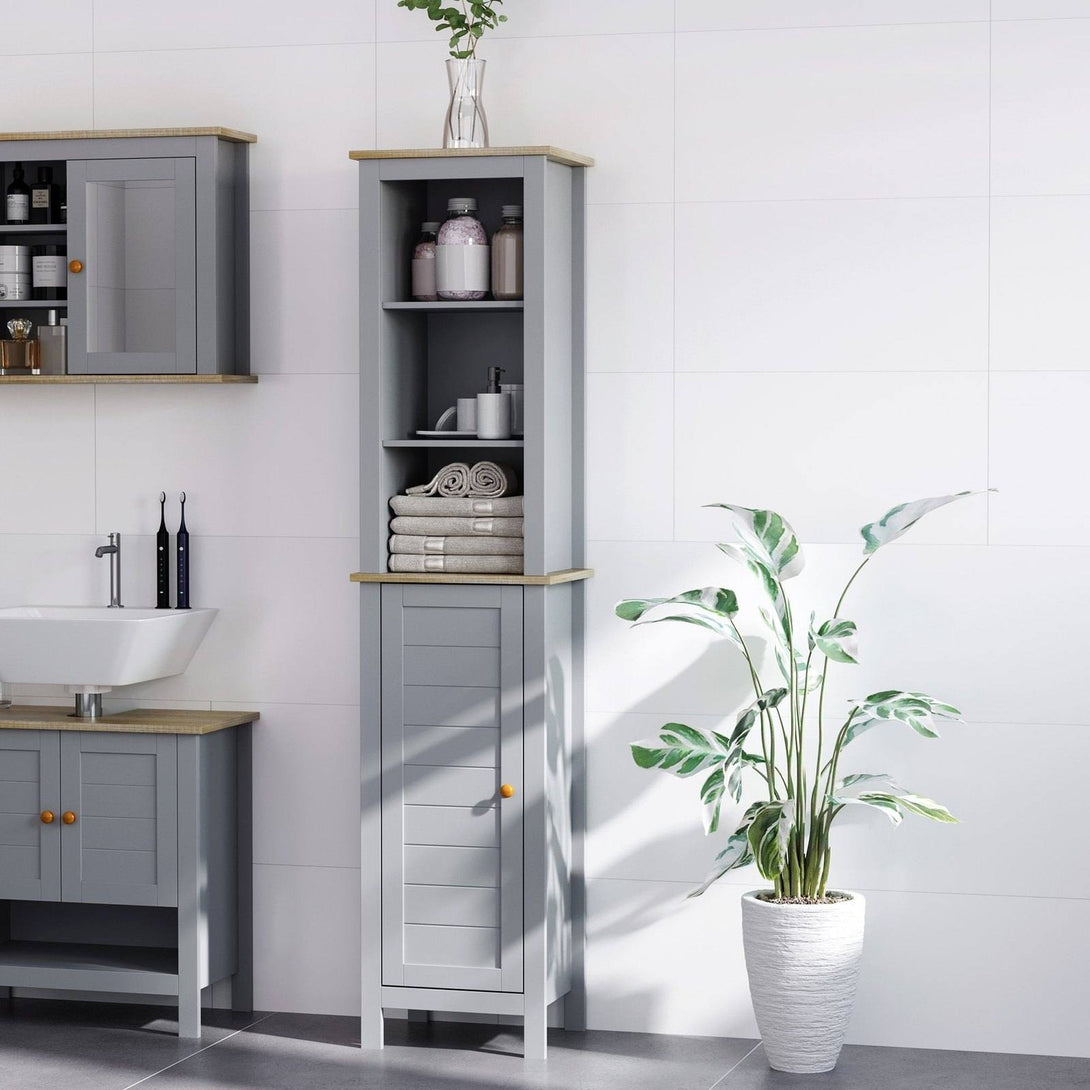 Bathroom storage doesn't always have to be clean and contemporary. If you're looking for something a little different - go for this narrow freestanding cabinet from kleankin. A slightly boxy shape pairs with the mid-grey tone and the contrasts with the wood-effect panels for some retro rustic charm. It is formed of a bottom cupboard and three upper shelves for decent amount of open and discreet storage. It's made from MDF, so it's durable, with the four stump legs preventing direct contact with the floor. Finished with a wooden handle on the door to open and close easily.