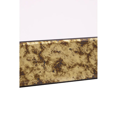 Horizontal wall mirror featuring bevellled edges and corners which give the design a touch of depth. The antique gold finish adorns the angled frame while it accentuates a distressed effect which gives the mirror an aged aesthetic.