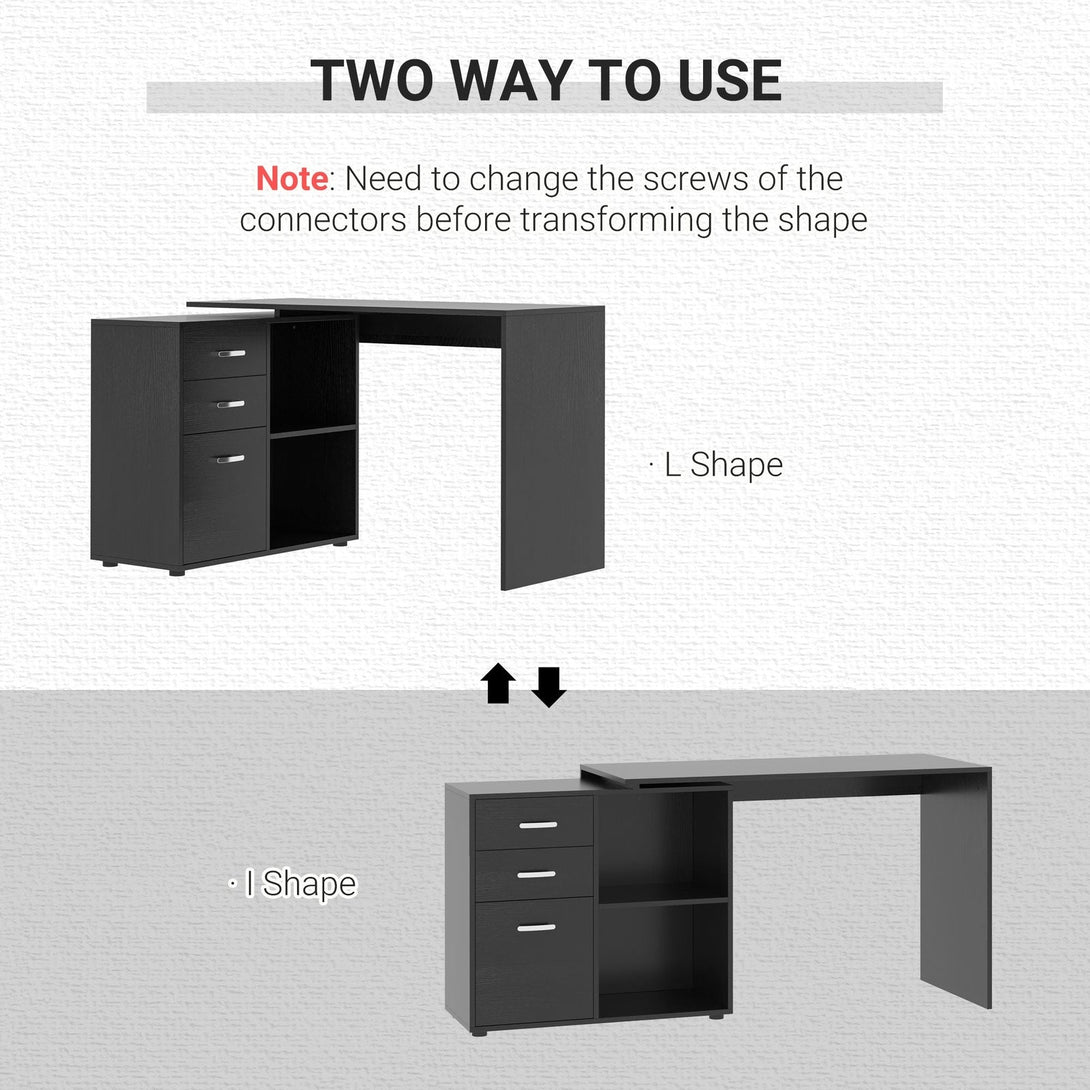 The HOMCOM corner desk is designed to be a stunning focal point in your contemporary home, office, or study. The simple and stylish piece features unique clean lines. The writing desk offers spacious working surface that is suitable for organising paperwork and using a computer. The secondary surface offers an additional work space and can be placed and stored for other items. This piece features a file cabinet , 2 drawers and 2 opens shelves that help to keep all your items organised.