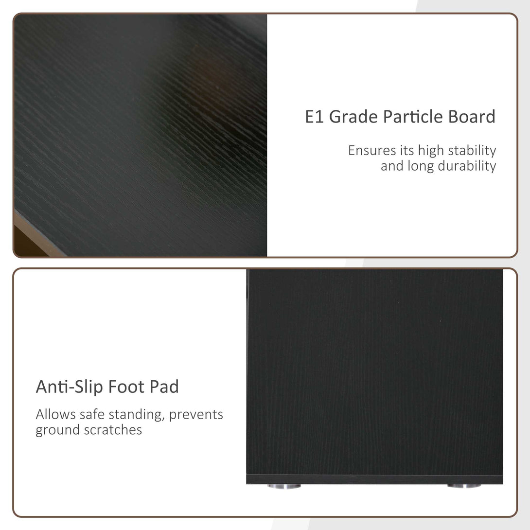 Efficiently save space with this computer desk from HOMCOM. Constructed from durable particle board with a smooth and easy-to-clean melamine surface, this L shaped desk features a desk and shelf that rotates180 degrees to suit you and the shape of your living space. Its large surface gives you plenty of room to work, and the extra storage is great for keeping all your important papers and other work documents. Clean black, it will blend beautifully into any style décor.