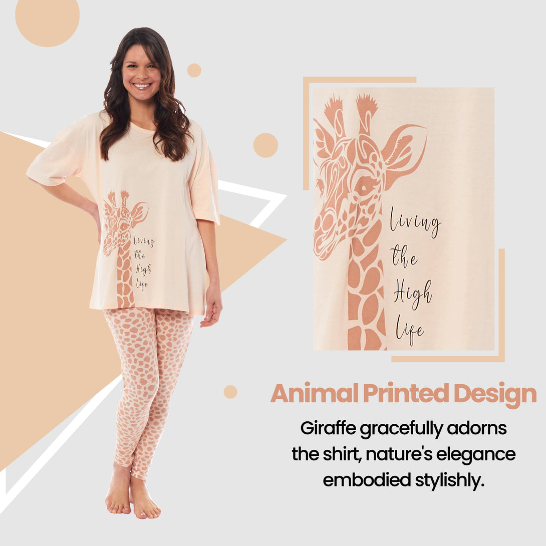 Women's Oversized Cotton T Shirt & Leggings PJ Set, Ladies Loungewear Sleepwear, Giraffe Zebra Printed Pyjama Designs