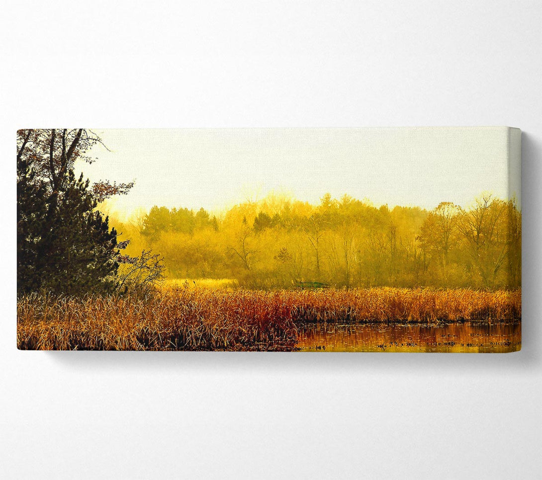 Lake In The Morning Sun canvas, printed on coated polyester canvas. Mounted on to a 44mm box frame, ready to hang.