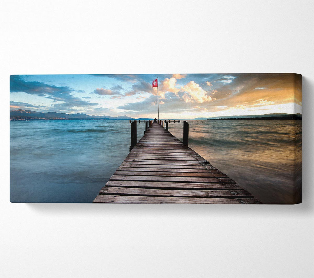 Lake Pontoon At Dusk canvas, printed on coated polyester canvas. Mounted on to a 44mm box frame, ready to hang.