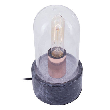 The base is made from real black marble with veins and swirls patterning its smooth surface. The copper coloured bulb fitting introduces a warm metallic tone to the lamp's cool nordic aesthetic. An edison-style bulb with its distinctive filament is protected by the removable glass cloche, the latter's rounded lines complementing the base.