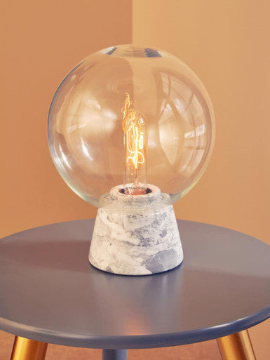 The lamp's marble base is completely solid, and provides ample support for the ethereal glass globe that sits safely on top of it, providing a contrast to the heavy, solid nature of the base. The clear glass globe looks great paired with a filament bulb.
