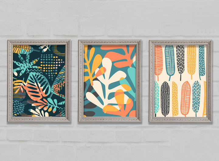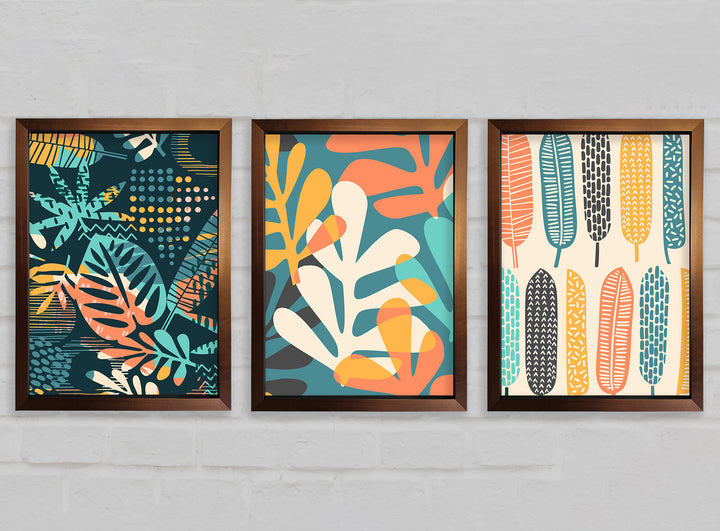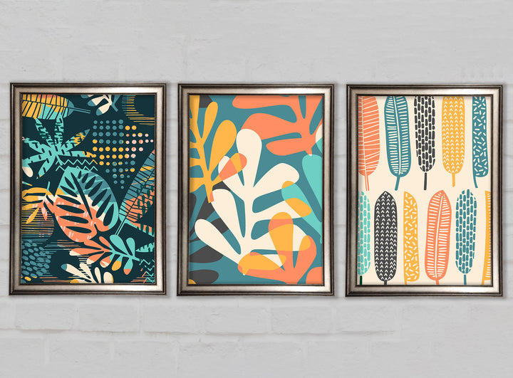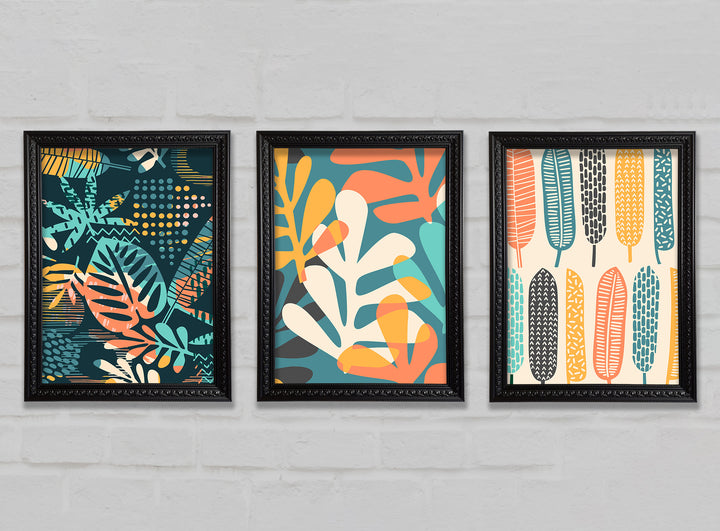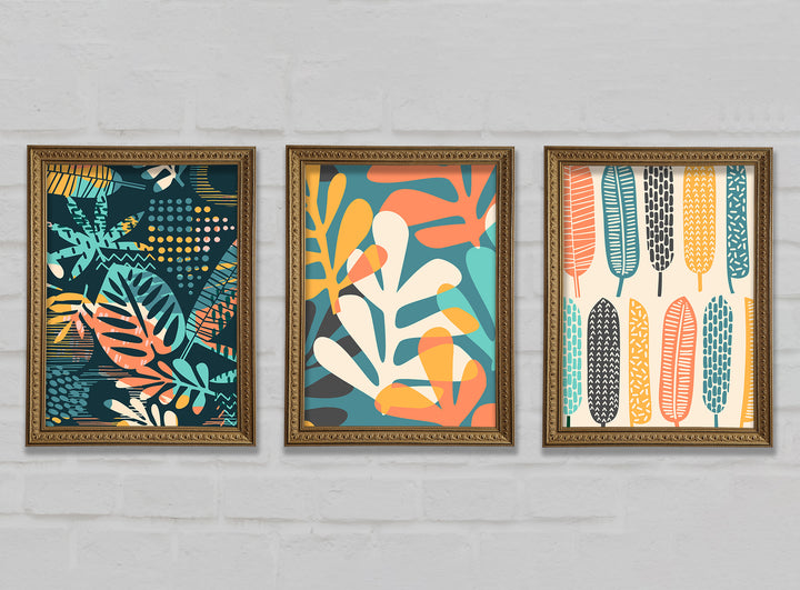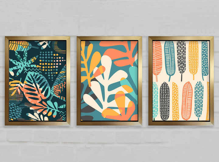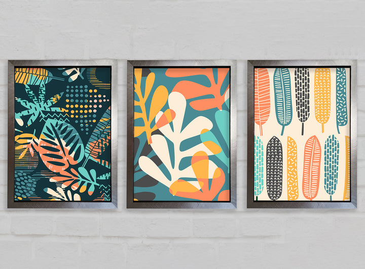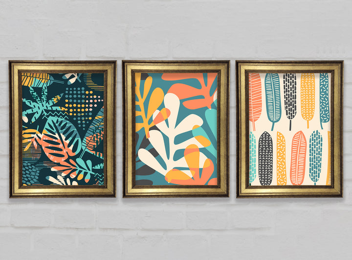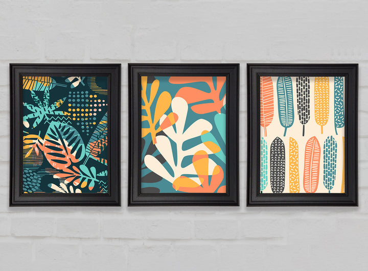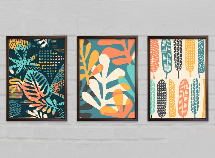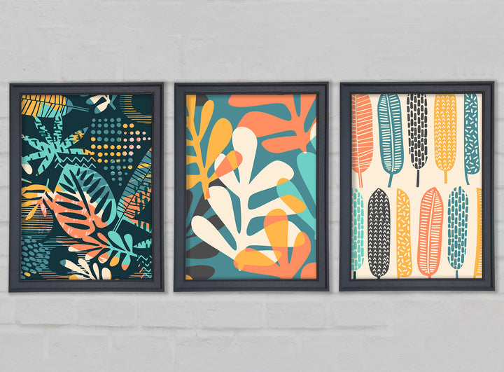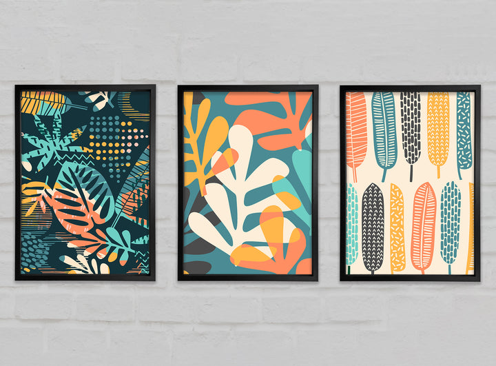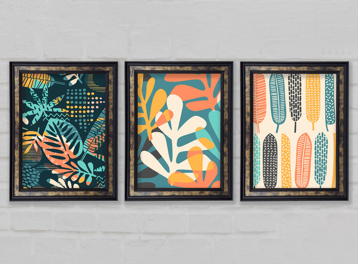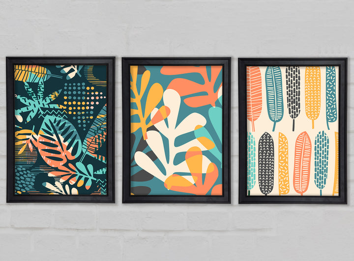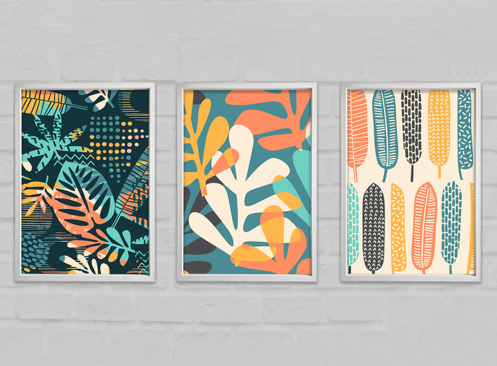 Leaves And Feathers set of 3 framed print wall art, available in mutiple frame colours. Ready to hang from the box and handmade in the United Kingdom.