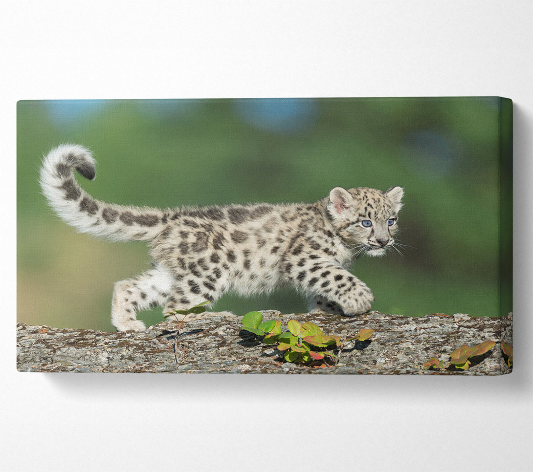 Leopard Cub walking a branch wide canvas, printed on coated polyester canvas. Mounted on to a 44mm box frame, ready to hang.