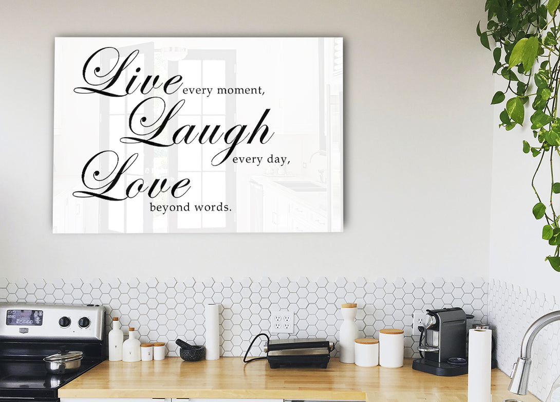 Live Laugh Love 2 White acrylic print, UV printed onto 5mm thick acrylic glass. Comes with everything you need to hang on your wall.