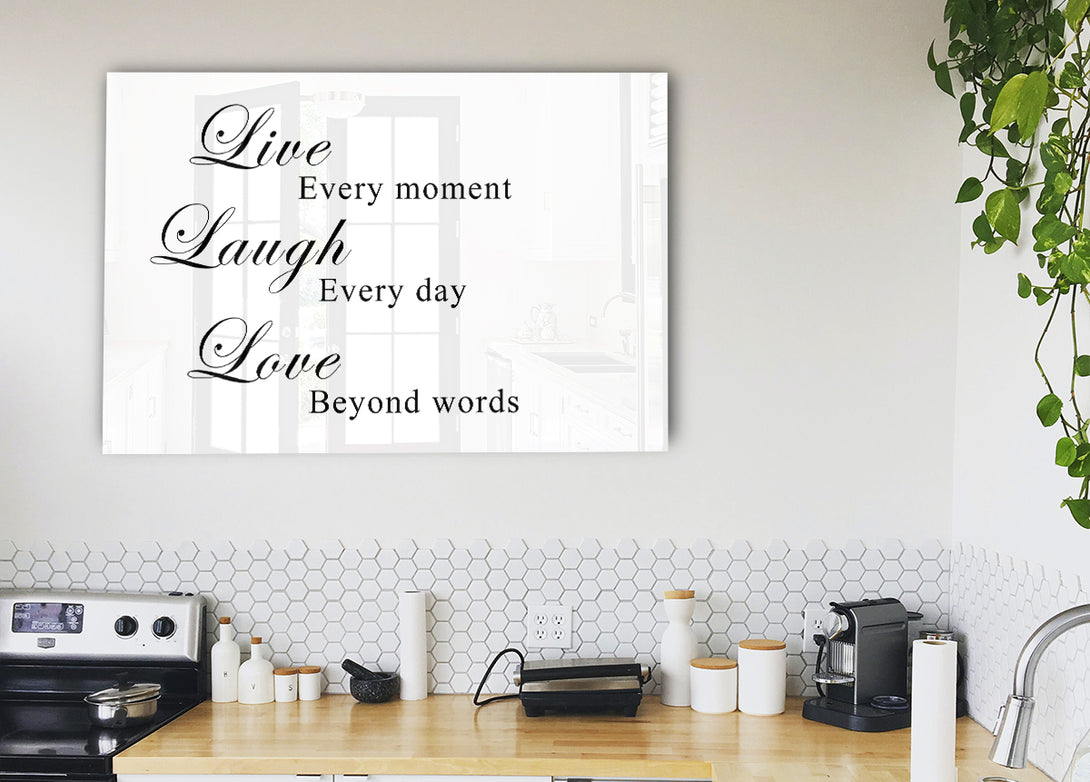 Live Laugh Love White acrylic print, UV printed onto 5mm thick acrylic glass. Comes with everything you need to hang on your wall.