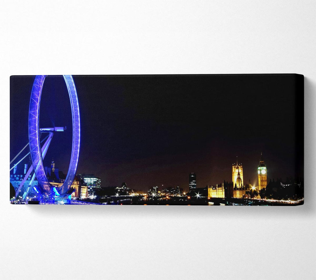 London Eye Blue Uk canvas, printed on coated polyester canvas. Mounted on to a 44mm box frame, ready to hang.
