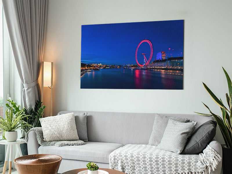 London Eye Pink Glow Printed on brushed aluminium dibond. A modern way to display art and easy to maintain.