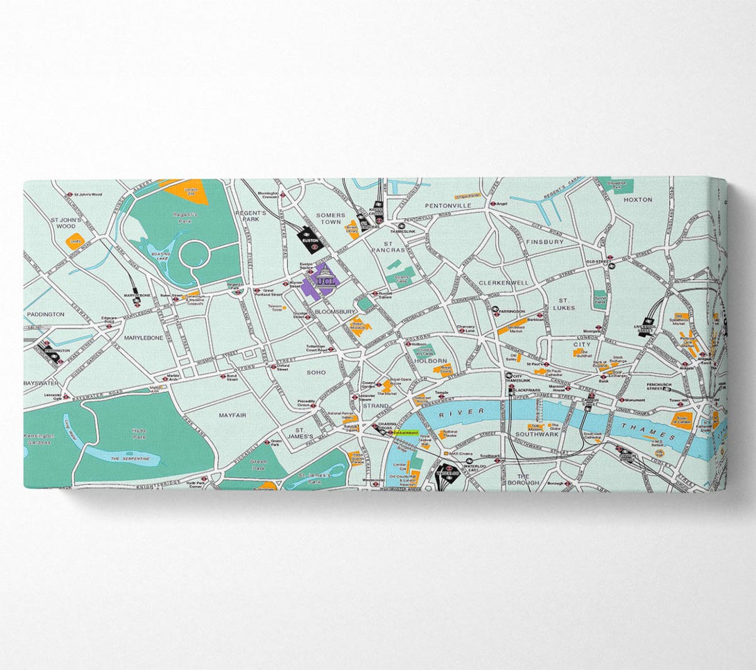 London Map canvas, printed on coated polyester canvas. Mounted on to a 44mm box frame, ready to hang.