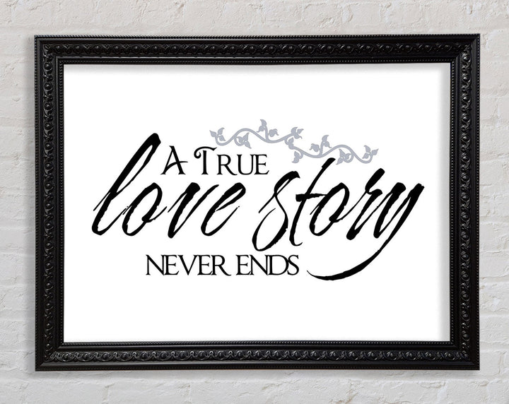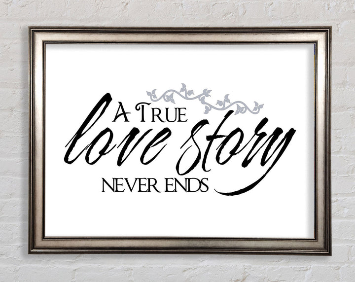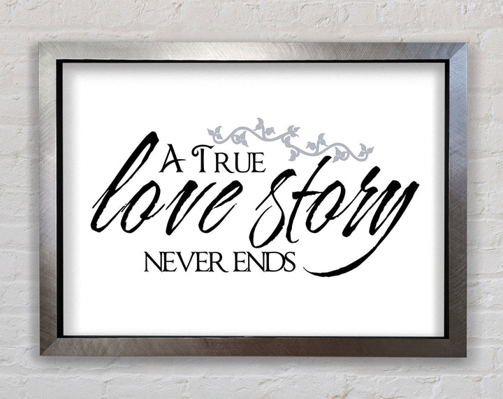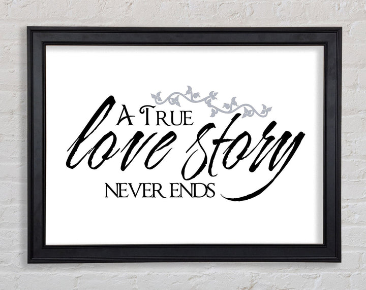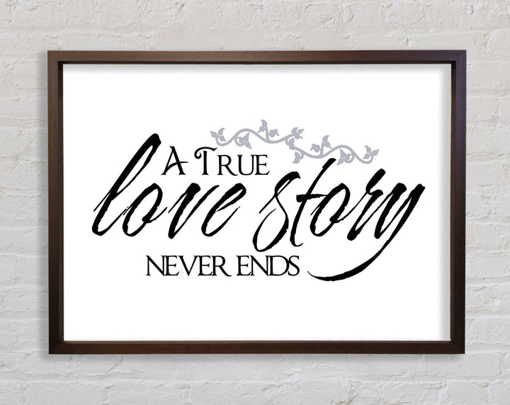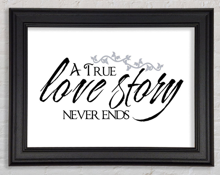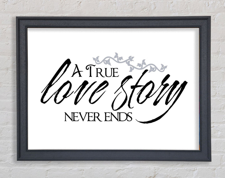 Celebrate timeless love with the "Love Quote: A True Love Story Never Ends" framed print. This elegant framed art piece is available in six sizes, ranging from small to oversized, ensuring a perfect fit for any space. Choose from a variety of colors to match your decor and add a personalized touch to your home. Handmade in the United Kingdom, each print is crafted with care and attention to detail. The frame is designed for easy hanging, making it simple to display this beautiful reminder of enduring love. Ideal as a gift or a charming addition to your own home, this framed art piece is a testament to love's everlasting journey.
