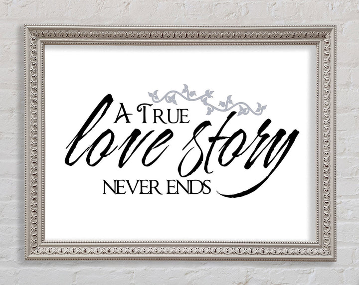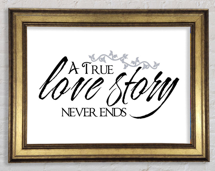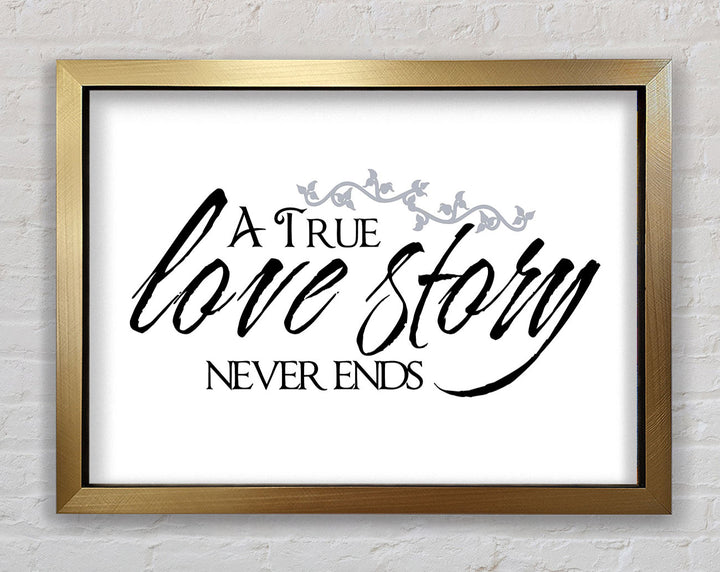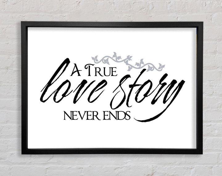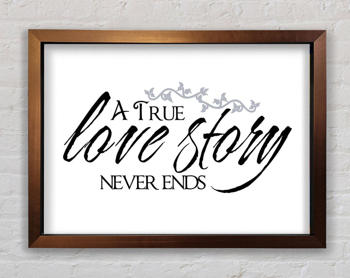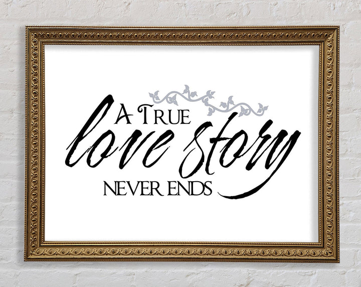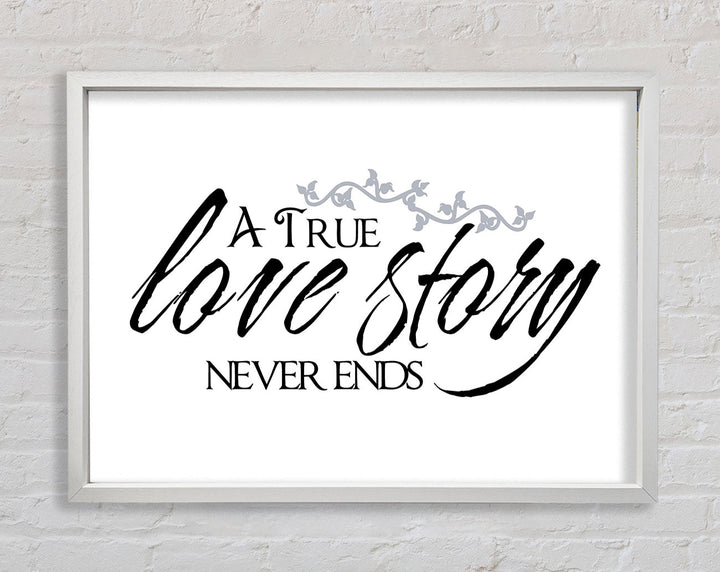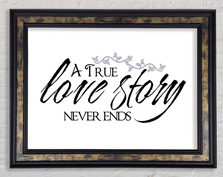 Celebrate timeless love with the "Love Quote: A True Love Story Never Ends" framed print. This elegant framed art piece is available in six sizes, ranging from small to oversized, ensuring a perfect fit for any space. Choose from a variety of colors to match your decor and add a personalized touch to your home. Handmade in the United Kingdom, each print is crafted with care and attention to detail. The frame is designed for easy hanging, making it simple to display this beautiful reminder of enduring love. Ideal as a gift or a charming addition to your own home, this framed art piece is a testament to love's everlasting journey.