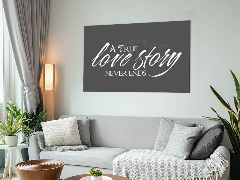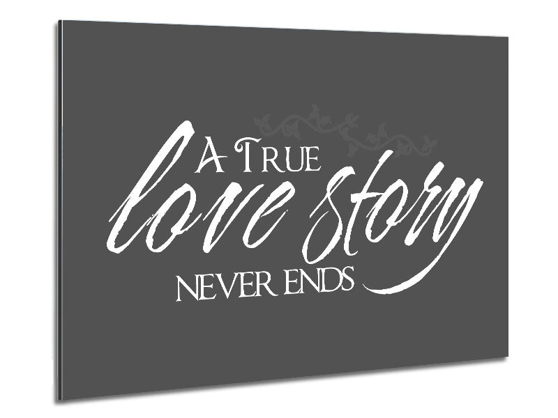 Love Quote A True Love Story Never Ends Grey Printed on brushed aluminium dibond. A modern way to display art and easy to maintain.
