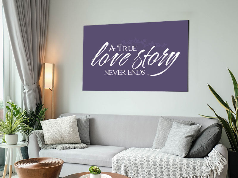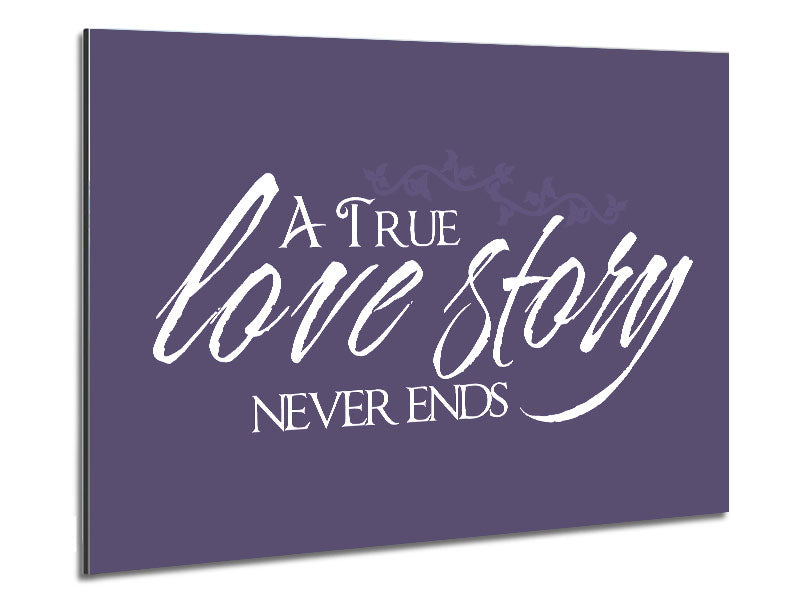 Love Quote A True Love Story Never Ends Lilac Printed on brushed aluminium dibond. A modern way to display art and easy to maintain.