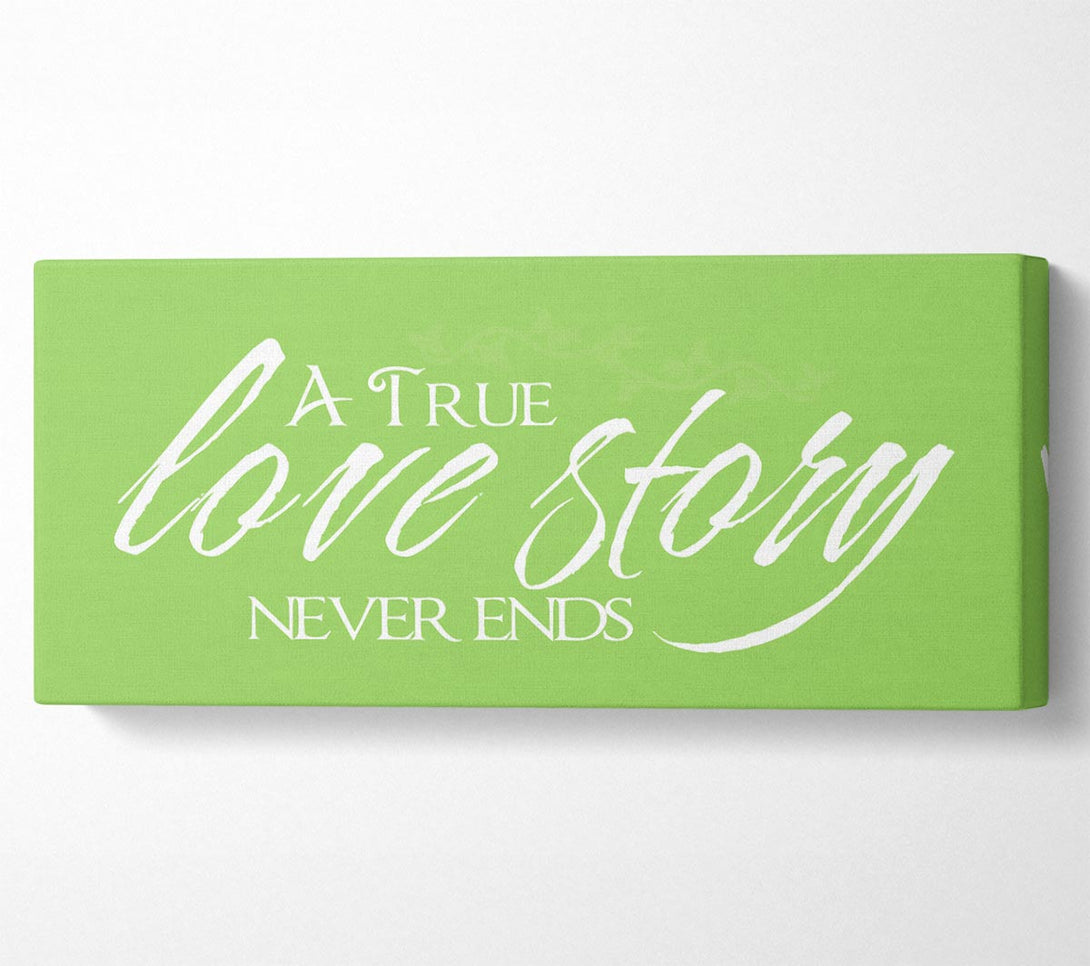 Love Quote A True Love Story Never Ends Lime Green canvas, printed on coated polyester canvas. Mounted on to a 44mm box frame, ready to hang.