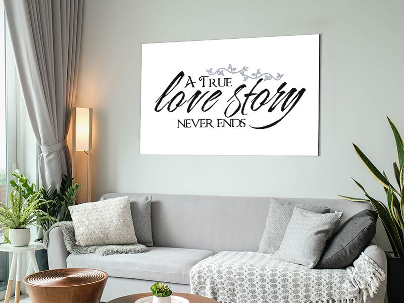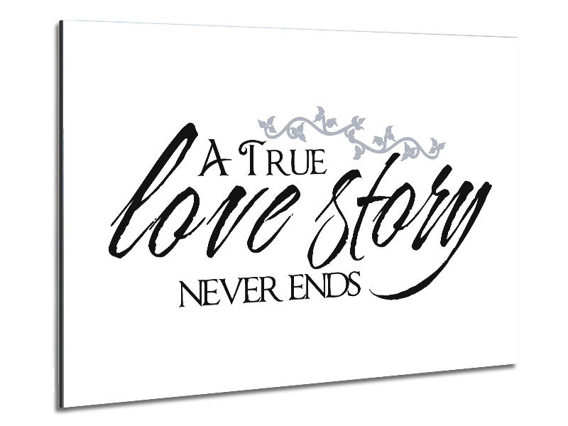 Love Quote A True Love Story Never Ends Printed on brushed aluminium dibond. A modern way to display art and easy to maintain.