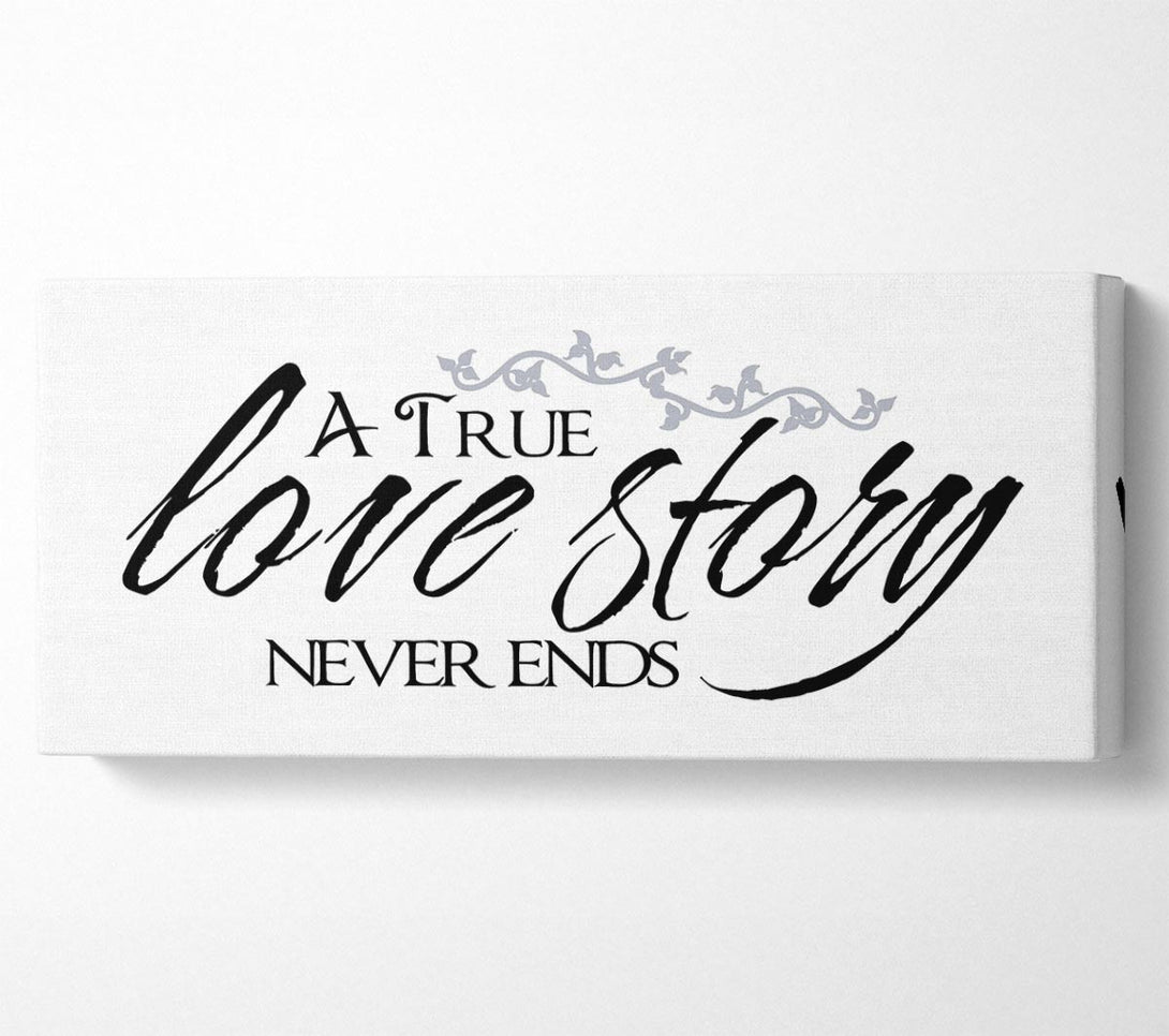Love Quote A True Love Story Never Ends canvas, printed on coated polyester canvas. Mounted on to a 44mm box frame, ready to hang.