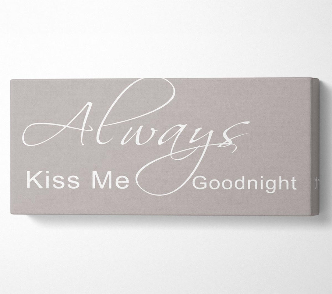 Love Quote Always Kiss Me Goodnight 2 Beige canvas, printed on coated polyester canvas. Mounted on to a 44mm box frame, ready to hang.
