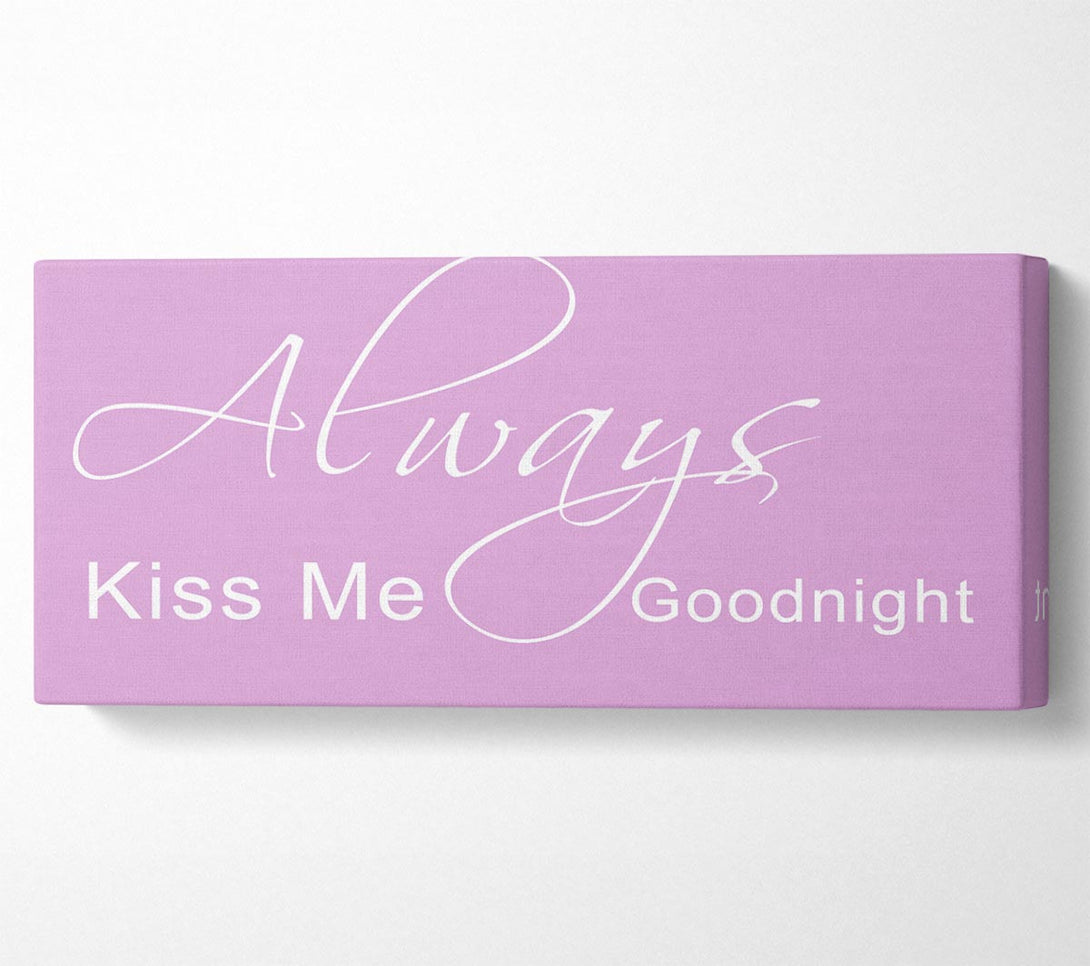 Love Quote Always Kiss Me Goodnight 2 Pink canvas, printed on coated polyester canvas. Mounted on to a 44mm box frame, ready to hang.