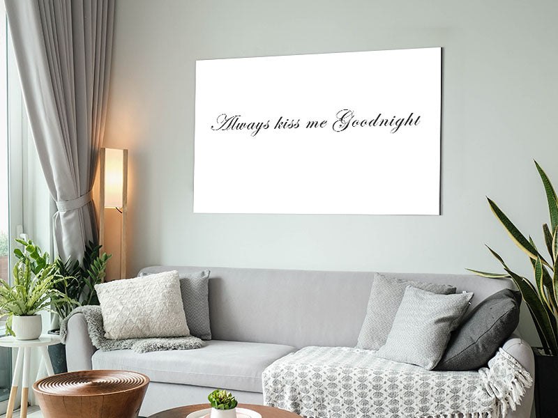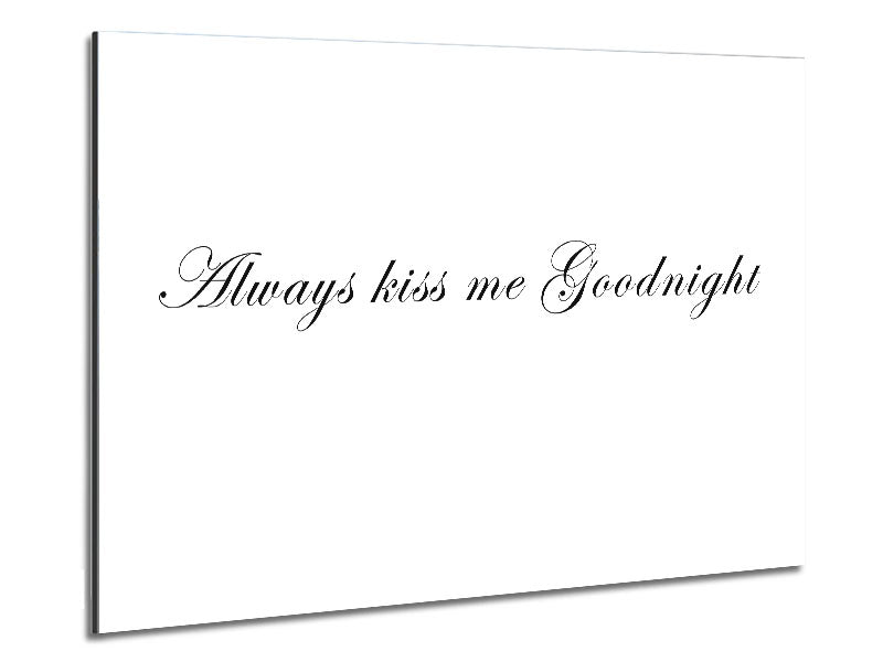 Love Quote Always Kiss Me Goodnight White Printed on brushed aluminium dibond. A modern way to display art and easy to maintain.