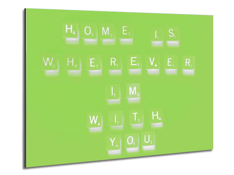 Love Quote Home Is Wherever Im With You Lime Green Printed on brushed aluminium dibond. A modern way to display art and easy to maintain.