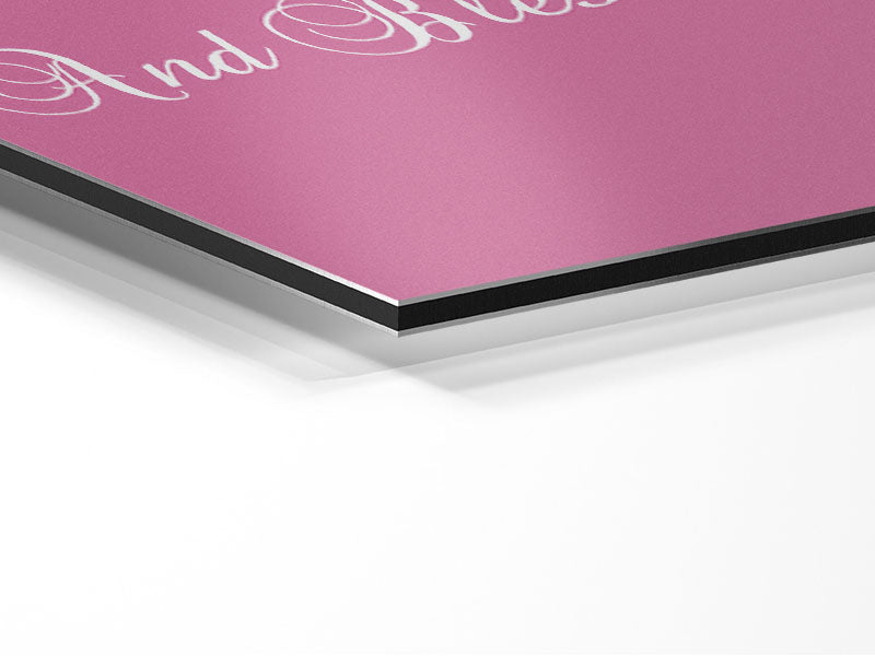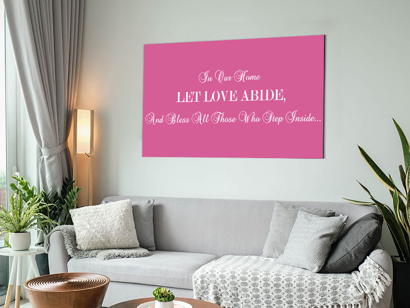 Love Quote In Our Home Let Love Abide Pink Printed on brushed aluminium dibond. A modern way to display art and easy to maintain.