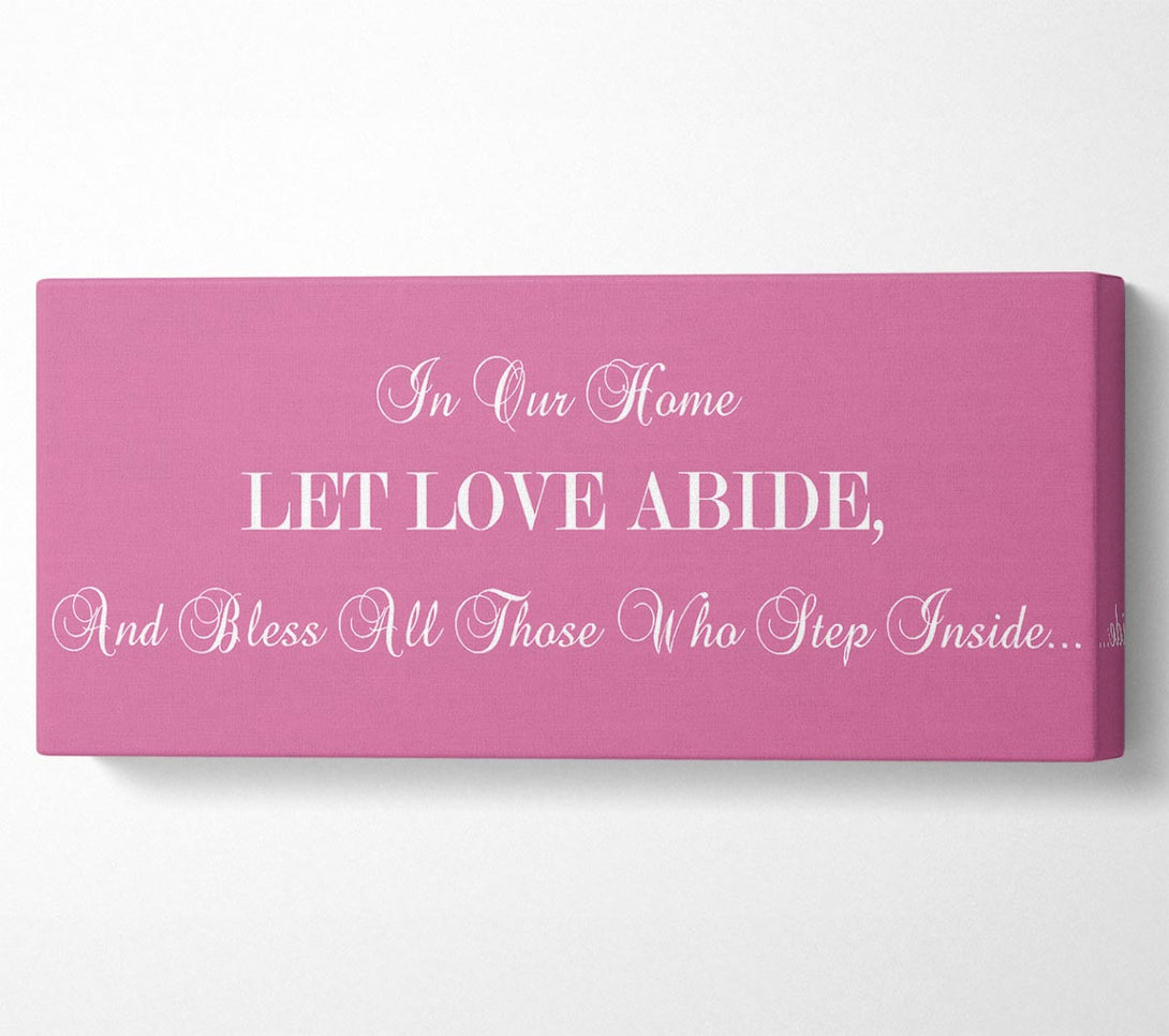 Love Quote In Our Home Let Love Abide Pink canvas, printed on coated polyester canvas. Mounted on to a 44mm box frame, ready to hang.