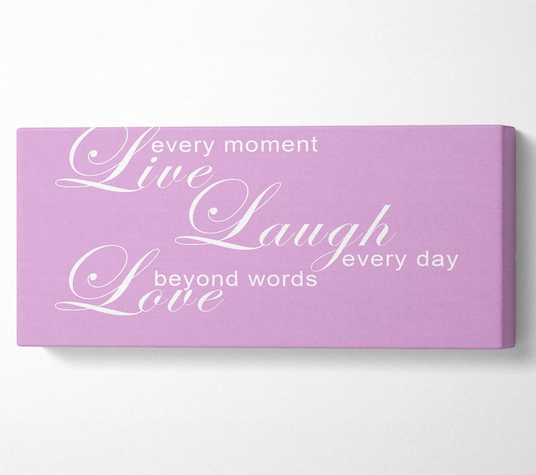 Love Quote Live Every Moment 3 Pink canvas, printed on coated polyester canvas. Mounted on to a 44mm box frame, ready to hang.