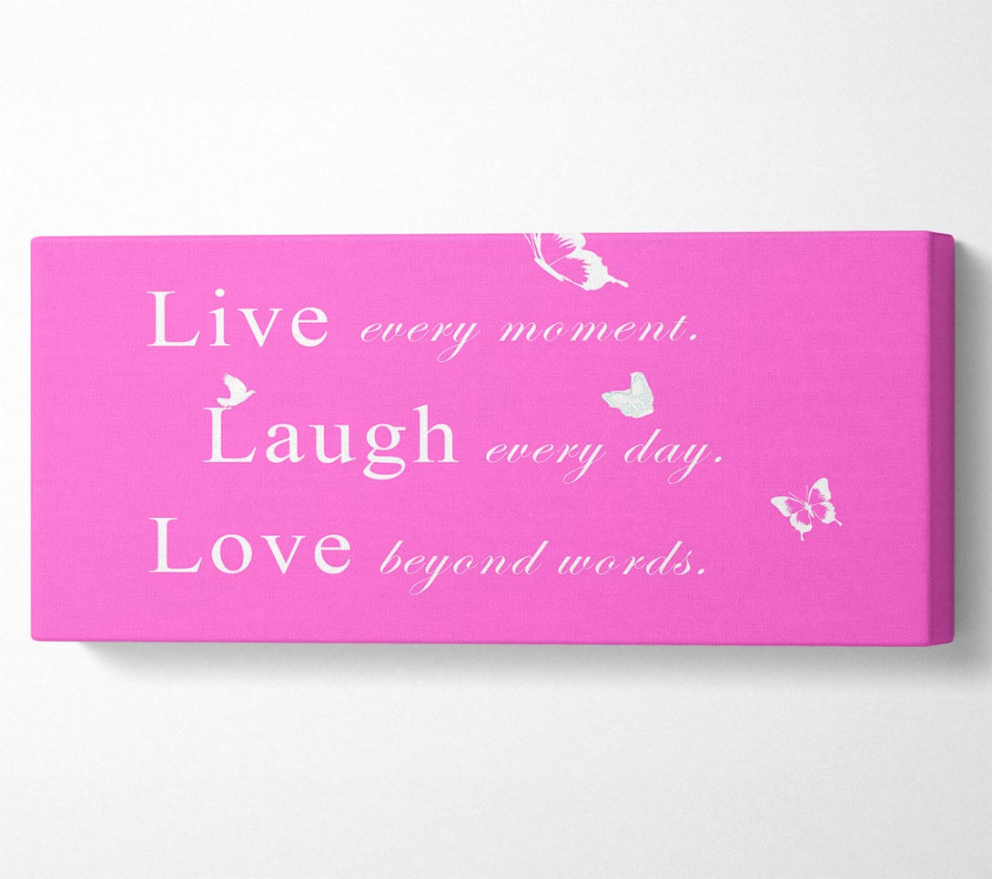 Love Quote Live Every Moment Vivid Pink canvas, printed on coated polyester canvas. Mounted on to a 44mm box frame, ready to hang.