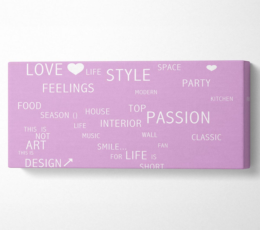 Love Quote Love Life Pink canvas, printed on coated polyester canvas. Mounted on to a 44mm box frame, ready to hang.