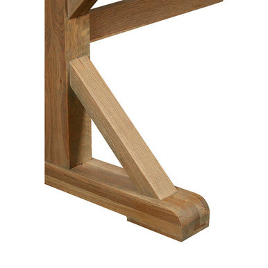 This dining table reflects the quintessential rustic style with solid American oakwood and crossed design legs. The light brown wood has a silver-grey grain that enhances the rustic aesthetic. The legs are connected by a beam for additional support.