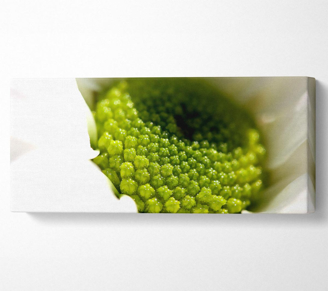 Macro Centre Of A Daisy canvas, printed on coated polyester canvas. Mounted on to a 44mm box frame, ready to hang.