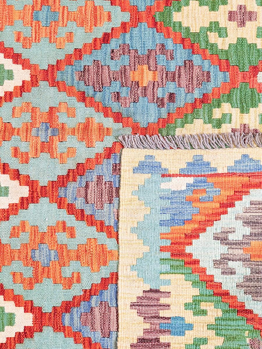 Bursting with vibrant hues and playful geometric patterns, this Afghan Kilim Rug is a celebration of craftsmanship, culture, and colour. Handwoven with 100% wool and naturally dyed, this beauty isn’t just a feast for the eyes—it’s also durable, lightweight, and fully reversible. Whether you’re jazzing up a neutral space or doubling down on bold aesthetics, this kilim has your back(and your floor!).