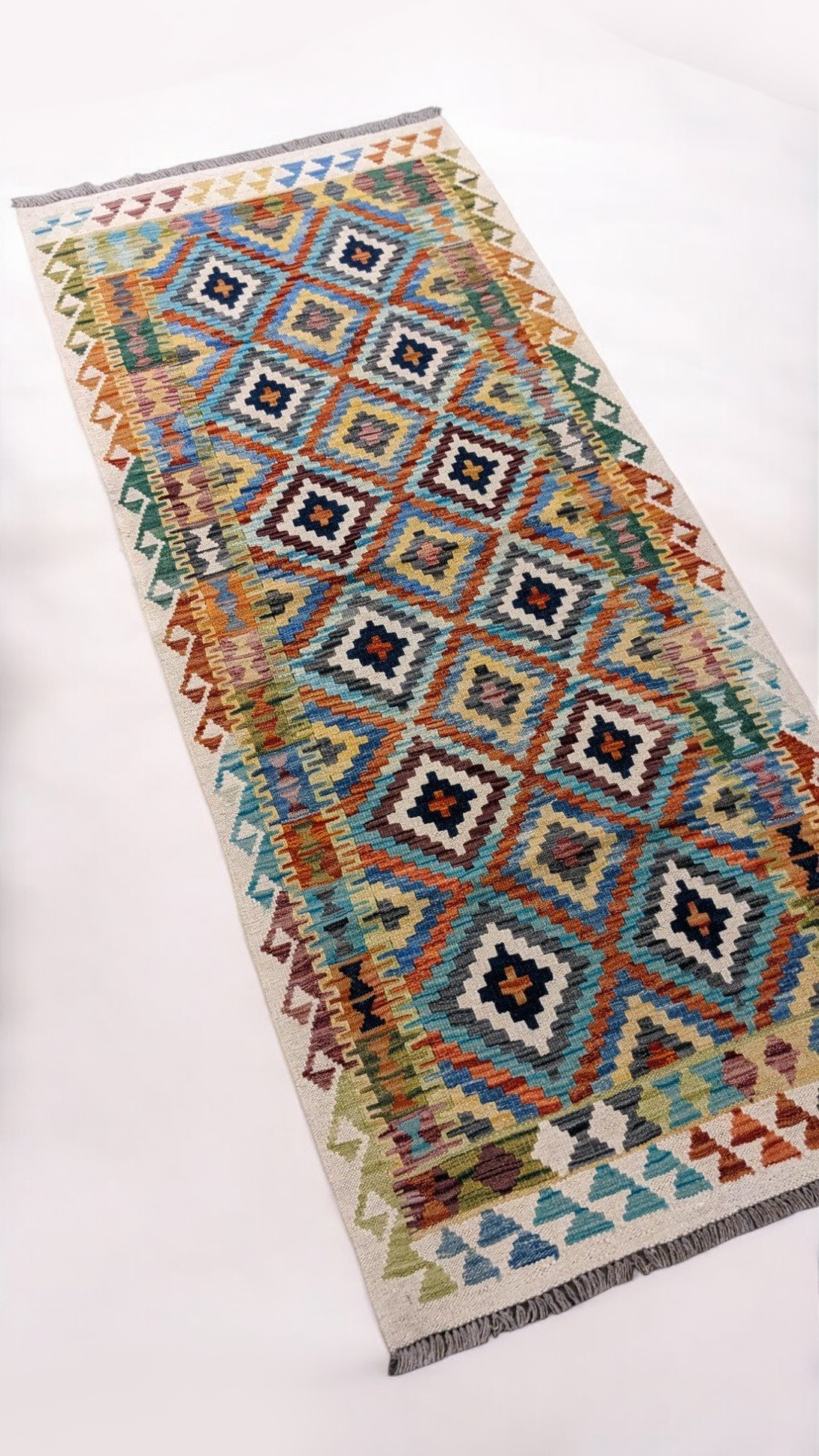 A journey through time, woven in wool. This Afghan kilim rug is like a magic carpet—minus the flying, but full of charm! The rug's mesmerizing diamond motifs and earthy tones create a rhythmic flow, making your hallway or bedside feel like a curated gallery of cultural heritage.