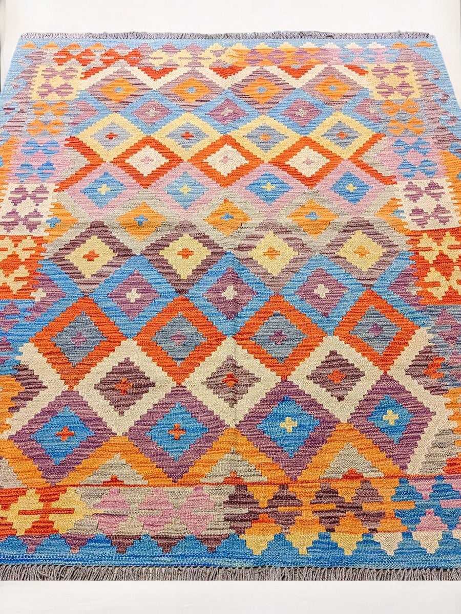 Discover the beauty of simplicity with this handwoven Afghan Kilim Rug. Unlike traditional pile rugs, this flatweave piece offers a sleek, low-profile design that's perfect for both modern and classic interiors. The intricate geometric patterns, characteristic of Afghan craftsmanship, are brought to life through a vibrant palette that's a testament to the power of color.