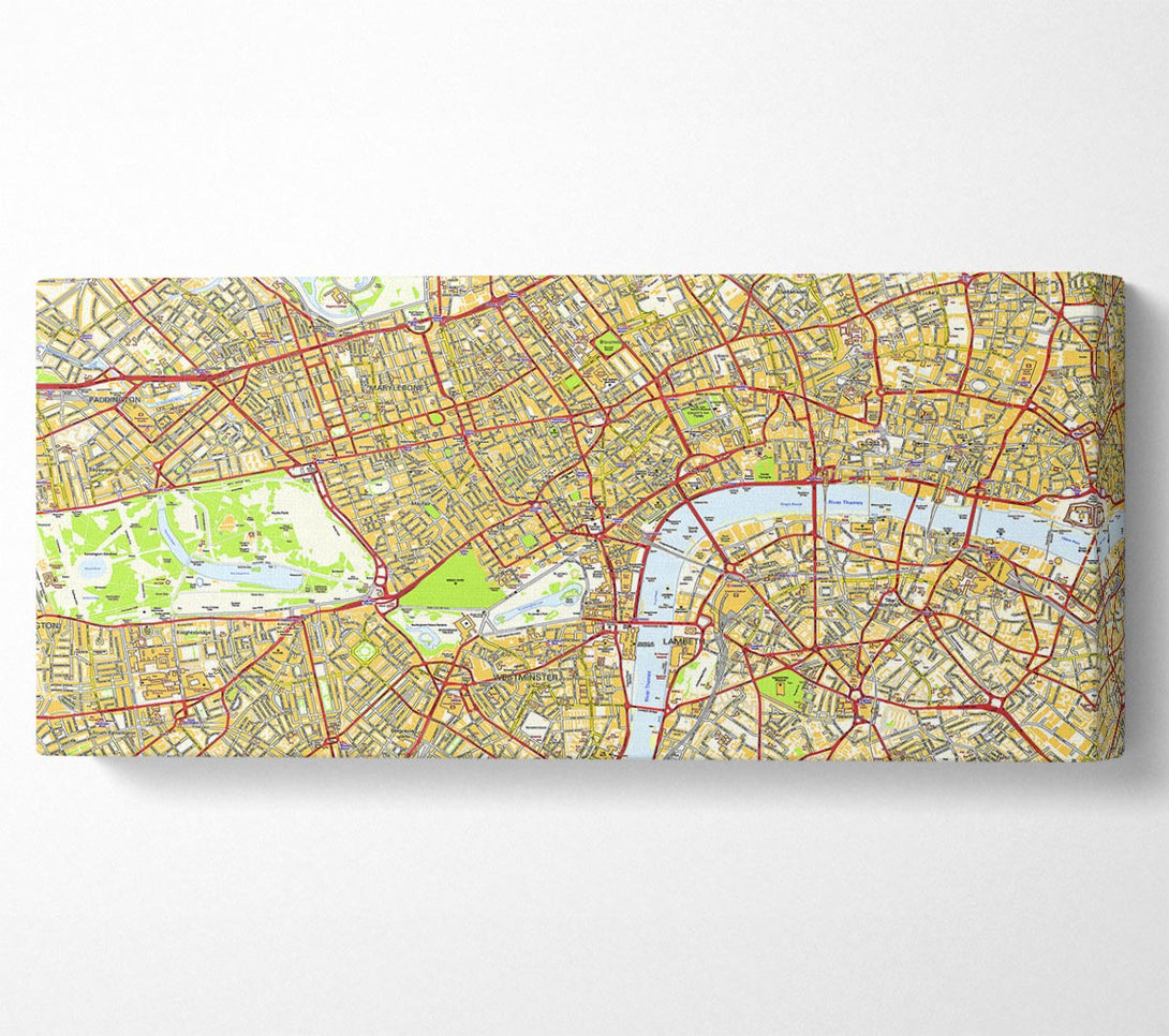 Map Of London canvas, printed on coated polyester canvas. Mounted on to a 44mm box frame, ready to hang.