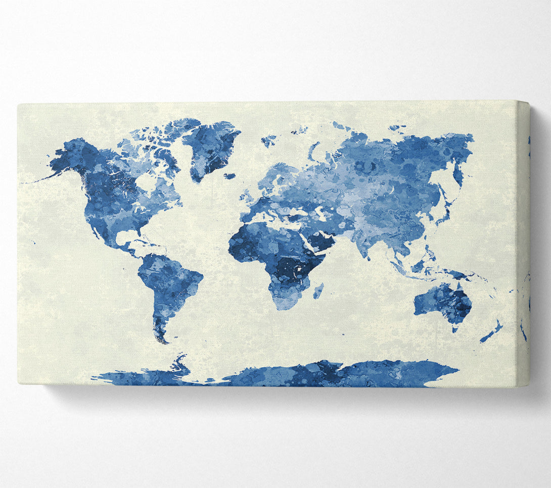 Map Of The World 4 wide canvas, printed on coated polyester canvas. Mounted on to a 44mm box frame, ready to hang.