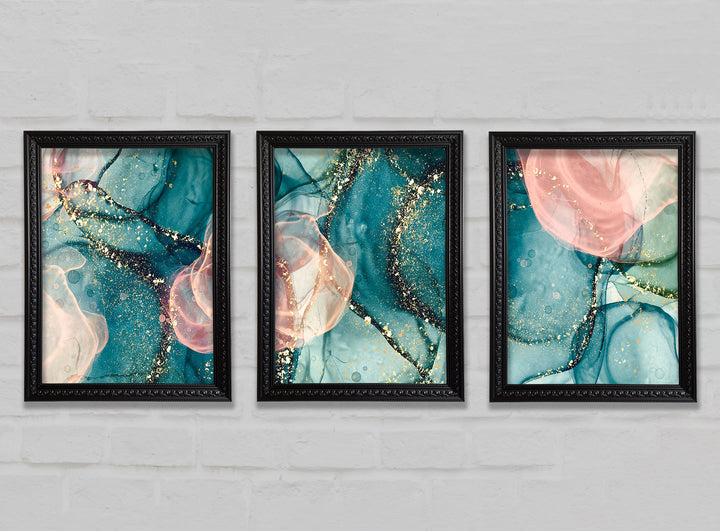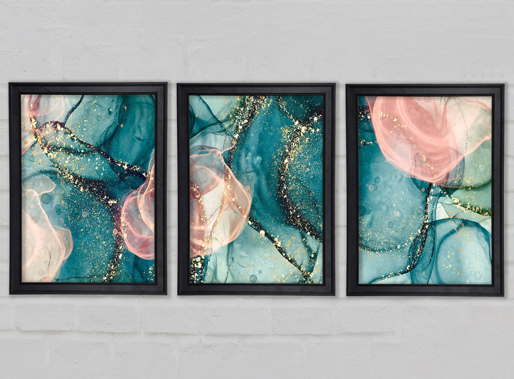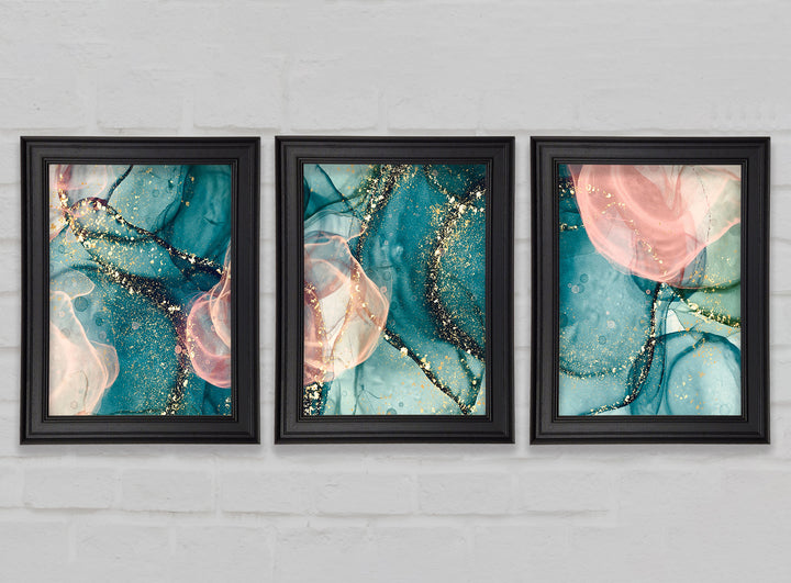 Marble Art Blue Pink and Gold set of 3 framed print wall art, available in mutiple frame colours. Ready to hang from the box and handmade in the United Kingdom.