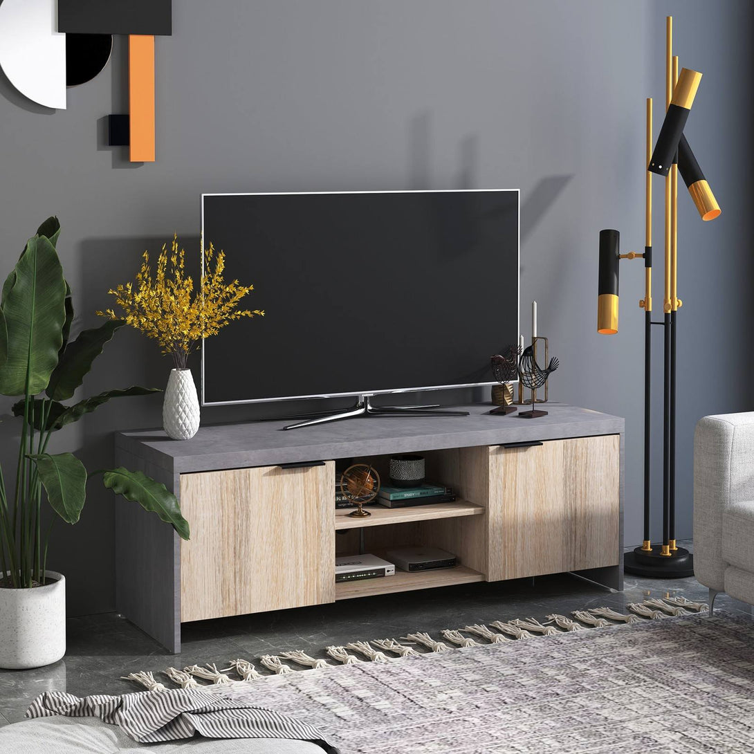 HOMCOM TV Cabinet is an ideal addition to fit into your modern simple lifestyle. It features the large top panel which holds up to 50 inch TV. There are also open display shelves to hold your entertainment equipment and two compartments with doors for loose accessories. It is easy to assemble, lightweight and space saving. Its cable management system and storage drawers help you maintain a tidy entertainment space.