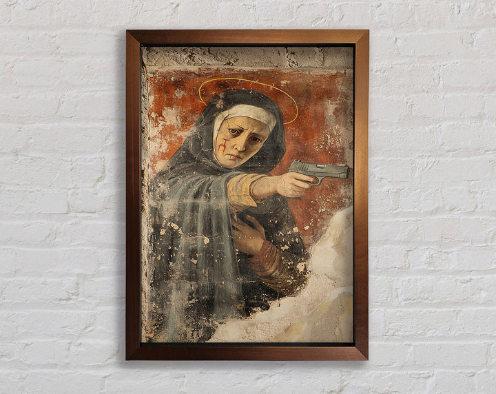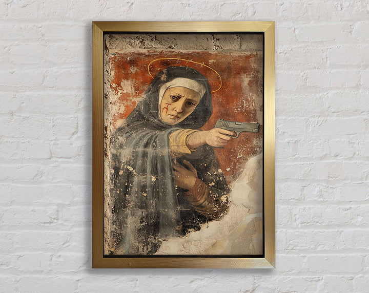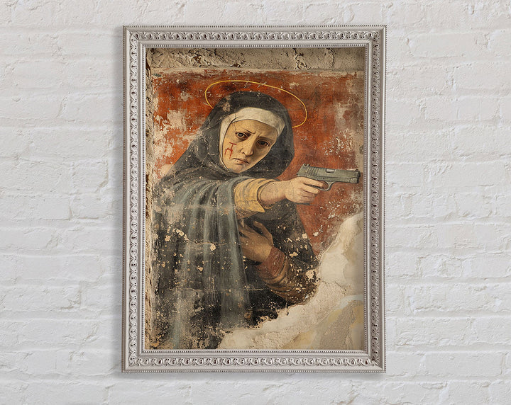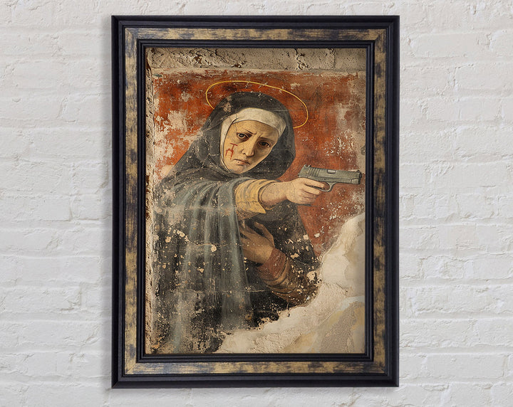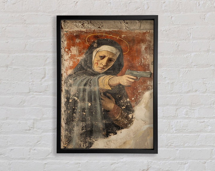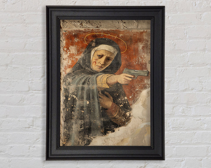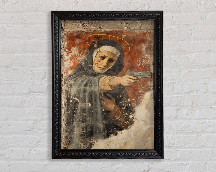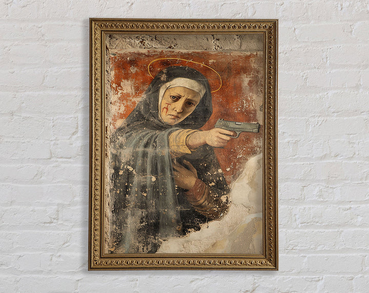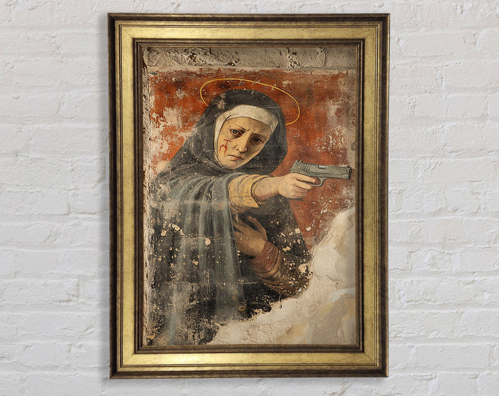 Introducing the Mary And A Gun Framed Print, a stunning piece of framed art that brings a bold statement to any space. This unique print is available in six sizes, from small to oversized, allowing you to find the perfect fit for your wall. Choose from a variety of colors to match your decor. Each piece is handmade in the United Kingdom, ensuring high-quality craftsmanship and attention to detail. The print comes ready to hang, making it easy to add a touch of elegance to your home or office. Elevate your interior design with this eye-catching and thought-provoking artwork today.