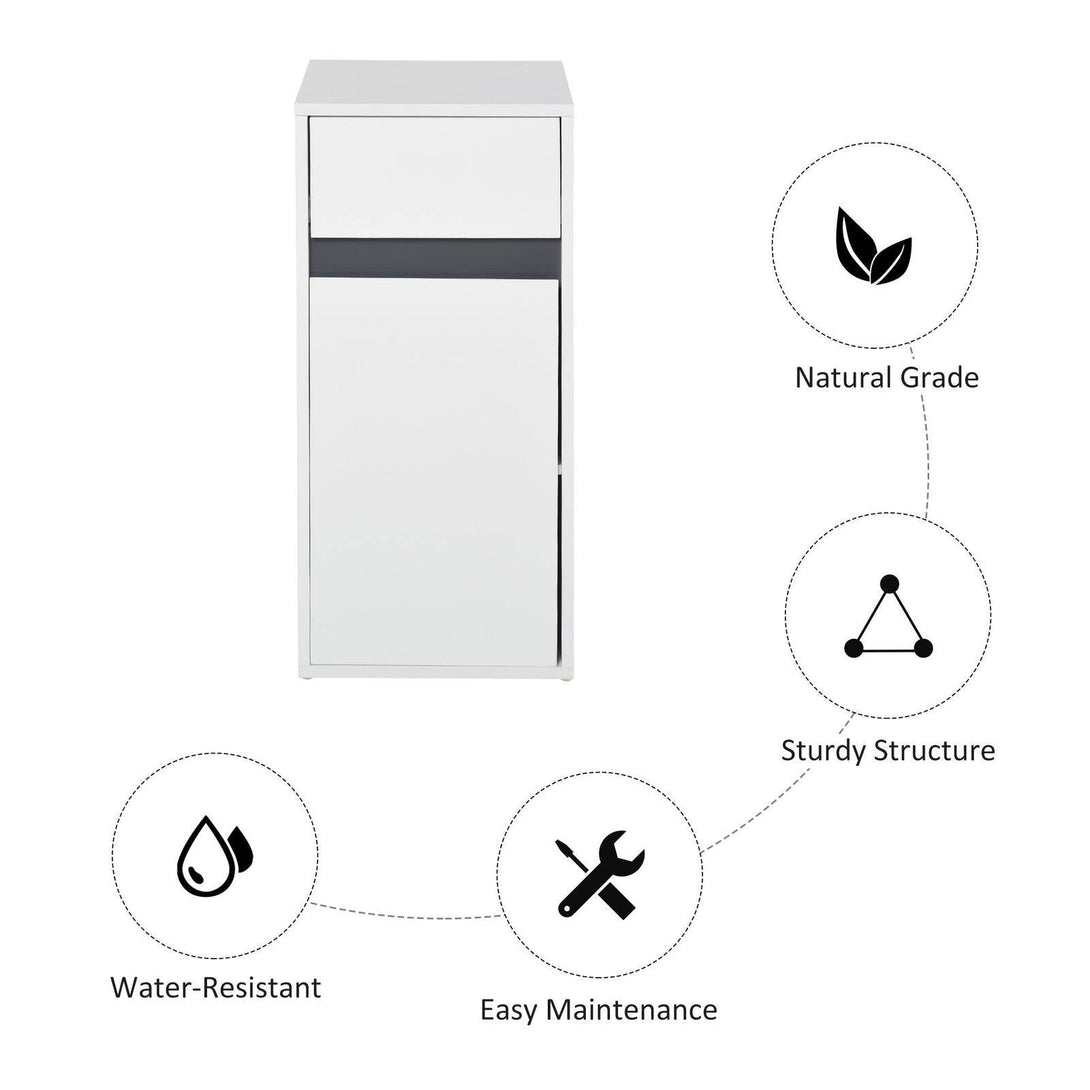 Introduce modern styling into your bathroom with this storage cabinet from HOMOM. Using white moisture-resistant MDF for the structure, and crafted into an effortlessly sleek design, it features a cupboard and drawer - both which are discreetly concealed so your bathroom adopts an ultra-tidy feel. Inside the cupboard, an adjustable shelf is placed to organise your bottles, toiletries and other products. Slightly small in size, it will perfectly fit into places with little space to spare, and it is finished with a flat top for extra holding room if required.
