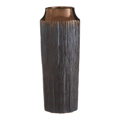This large vase is skilfully handcrafted from robust ceramic and its slender profile makes it a timeless and trendy signature piece. The inconsistent ridges on this vase create a textured surface and the warm metallic finish lends depth and character to the area.